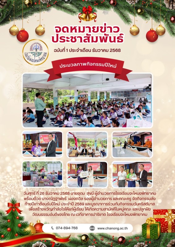วันศุกร์ ที่ 26 ธันวาคม 2568 นายอุดม สุขมี ผู้อำนวยการโรงเรียนจะโหนงพิทยาคมพร้อมด้วย นางณัฏฐาพัชร์ ผ่องถวิล รองผู้อำนวยการ และคณะครู จัดกิจกรรมส่งท้ายปีเก่าต้อนรับปีใหม่ ประจำปี 2569 และบูรณาการร่วมกับกิจกรรมวันคริสต์มาสเพื่อสร้างขวัญกำลังใจให้แก่ผู้เรียน ให้เกิดความสามัคคีในหมู่คณะ และปลูกฝังวัฒนธรรมอันดีของไทย ณ เวที่อาคารปาริชาต โรงเรียนจะไหนงพิทยาคม |