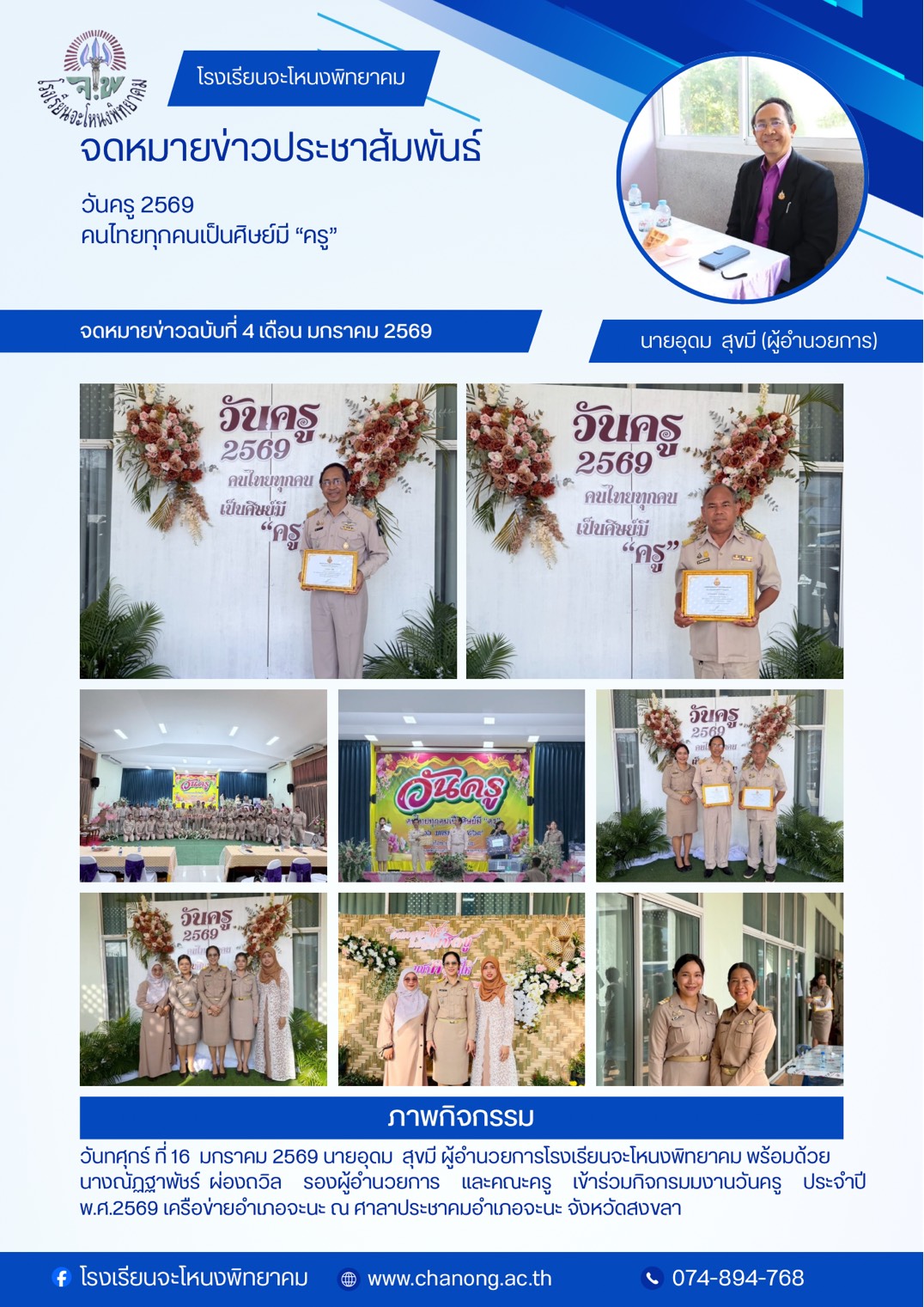| วันศุกร์ที่ 16 มกราคม 2569 นายอุดม สุขมี ผู้อำนวยการโรงเรียนจะโหนงพิทยาคม นางณัฏฐาพัชร์ ผ่องถวิล รองผู้อำนวยการและคณะครู เข้าร่วมกิจกรรมงานวันครูเครือข่ายอำเภอจะนะ ประจำปี พ.ศ.2569 ณ ศาลาประชาคมอำเภอจะนะ จังหวัดสงขลา |