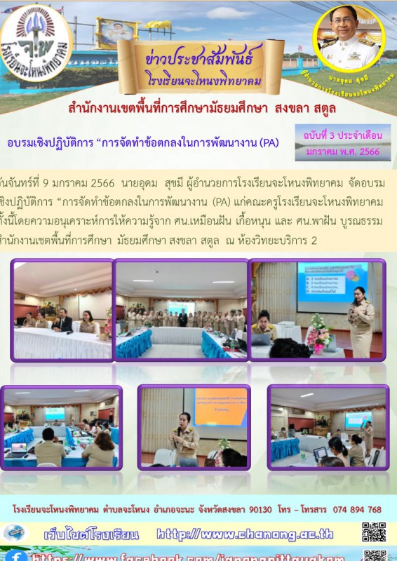 วันจันทร์ที่ 9 มกราคม 2566 นายอุดม สุขมี ผู้อำนวยการโรงเรียนจะโหนงพิทยาคม จัดอบรมเชิงปฏิบัติการ “การจัดทำข้อตกลงในการพัฒนางาน (PA) แก่คณะครูโรงเรียนจะโหนงพิทยาคม ทั้งนี้โดยความอนุเคราะห์การให้ความรู้จาก ศน.เหมือนฝัน เกื้อหนุน และ ศน.พาฝัน บูรณธรรม สำนักงานเชตพื้นที่การศึกษา มัธยมศึกษา สงขลา สตูล ณ ห้องวิทยะบริการ 2