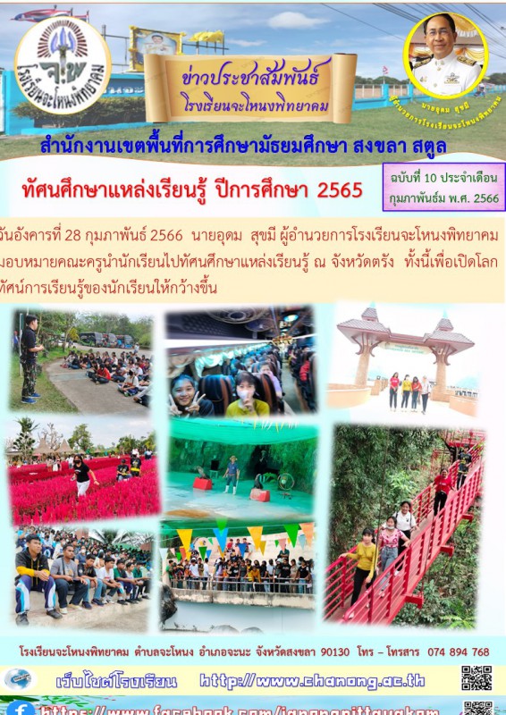 วันอังคารที่ 28 กุมภาพันธ์ 2566 นายอุดม สุขมี ผู้อำนวยการโรงเรียนจะโหนงพิทยาคม มอบหมายคณะครูนำนักเรียนไปทัศนศึกษาแหล่งเรียนรู้ ณ จังหวัดตรัง ทั้งนี้เพื่อเปิดโลกทัศน์การเรียนรู้ของนักเรียนให้กว้างขึ้น