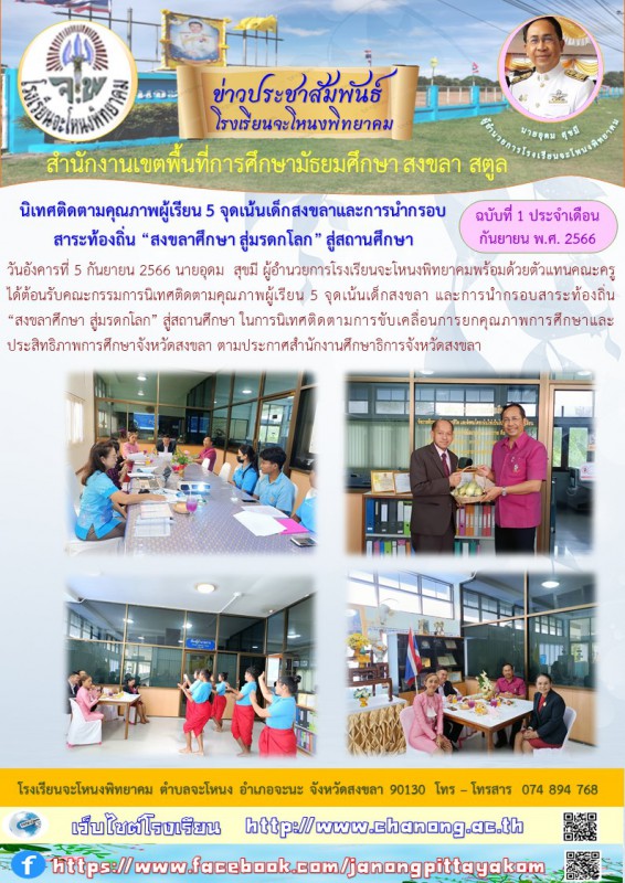 วันอังคารที่ 5 กันยายน 2566 นายอุดม สุขมี ผู้อำนวยการโรงเรียนจะโหนงพิทยาคมพร้อมด้วยตัวแทนคณะครู ได้ต้อนรับคณะกรรมการนิเทศติดตามคุณภาพผู้เรียน 5 จุดเน้นเด็กสงขลา และการนำกรอบสาระท้องถิ่น “สงขลาศึกษา สู่มรดกโลก” สู่สถานศึกษา ในการนิเทศติดตามการขับเคลื่อนการยกคุณภาพการศึกษาและประสิทธิภาพการศึกษาจังหวัดสงขลา ตามประกาศสำนักงานศึกษาธิการจังหวัดสงขลา