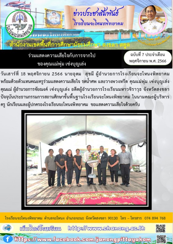 วันเสาร์ที่ 18 พฤศจิกายน 2566 นายอุดม สุขมี ผู้อำนวยการโรงเรียนจะโหนงพิทยาคม พร้อมด้วยตัวแทนคณะครูร่วมแสดงความเสียใจ รดน้ำศพ และวางพวงหรีด คุณแม่พุ่ม เซ่งบุญเล่ง คุณแม่ ผู้อำนวยการชัยณงค์ เซ่งบุญเล่ง อดีตผู้อำนวยการโรงเรียนมหาวชิราวุธ จังหวัดสงขลา ปัจจุบันประธานกรรมการสถานศึกษาขั้นพื้นฐานโรงเรียนจะโหนงพิทยาคม ในนามคณะผู้บริหาร ครู นักเรียนและผู้ปกครองโรงเรียนจะโหนงพิทยาคม ขอแสดงความเสียใจด้วยครับ