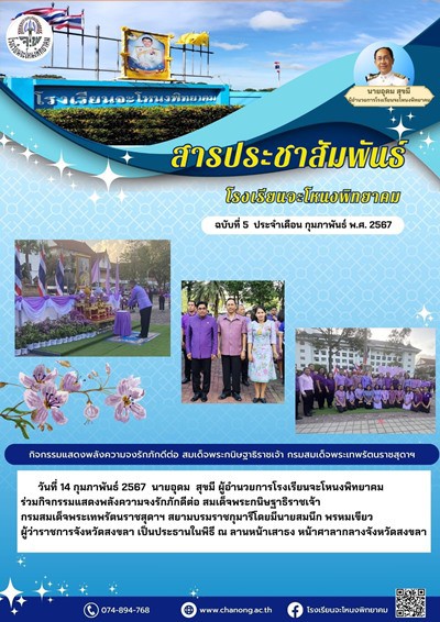 วันที่ 14 กุมภาพันธ์ 2567 นายอุดม สุขมี ผู้อำนวยการโรงเรียนจะโหนงพิทยาคม ร่วมกิจกรรมแสดงพลังความจงรักภักดีต่อ สมเด็จพระกนิษฐาธิราชเจ้า กรมสมเด็จพระเทพรัตนราชสุดาฯ สยามบรมราชกุมารีโดยมีนายสมนึก พรหมเขียว ผู้ว่าราชการจังหวัดสงขลา เป็นประธานในพิธี ณ ลานหน้าเสาธง หน้าศาลากลางจังหวัดสงขลา