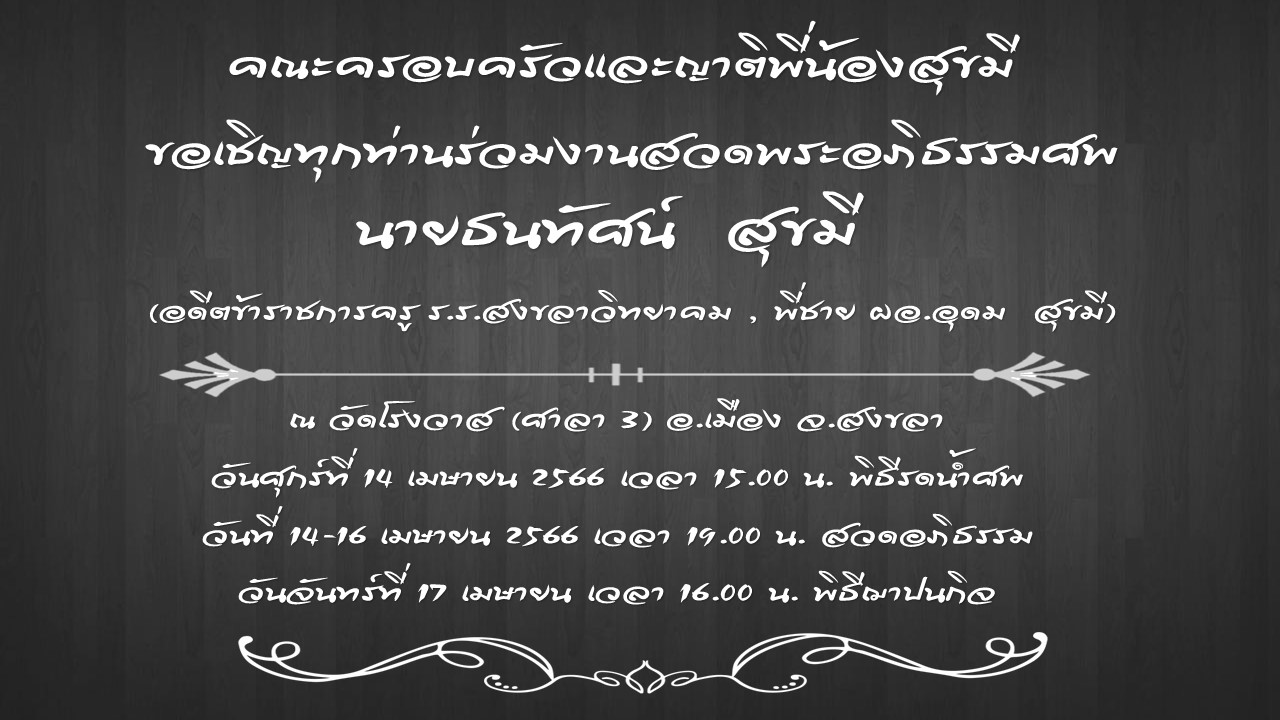 ขอเชิญทุกท่านร่วมงานสวดพระอภิธรรมศพ นายธนทัศน์ สุขมี (พี่ชายผอ.อุดม สุขมี)