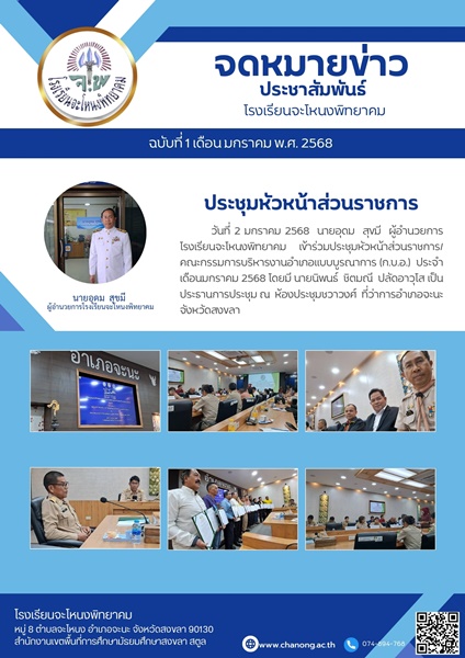 | วันที่ 2 มกราคม 2568 นายอุดม สุขมี ผู้อำนวยการโรงเรียนจะโหนงพิทยาคม เข้าร่วมประชุมหัวหน้าส่วนราชการ/คณะกรรมการบริหารงานอำเภอแบบบูรณาการ (ก.บ.อ.) ประจำเดือนมกราคม 2568 โดยมี นายนิพนธ์ ชิตมณี ปลัดอาวุโส เป็นประธานการประชุม ณ ห้องประชุมชวาวงศ์ ที่ว่าการอำเภอจะนะจังหวัดสงขลา |